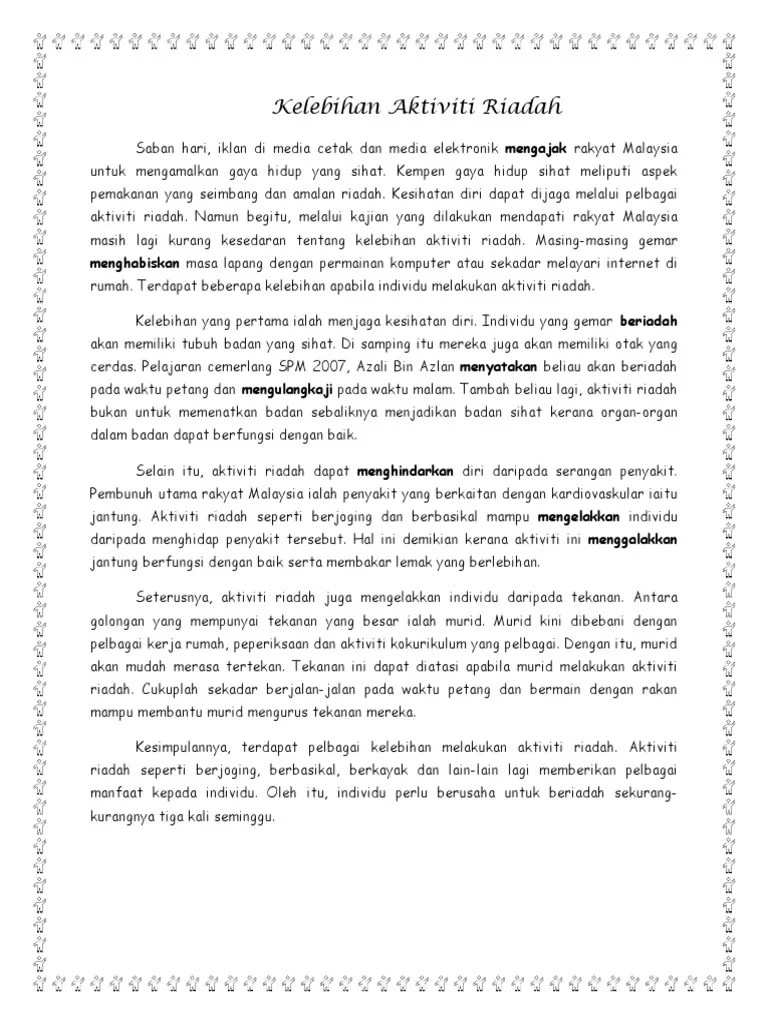 Antara cara bagi memastikan kesihatan diri berada dalam keadaan baik adalah dengan melakukan aktiviti riadah. Ianya terdiri daripada pendahuluan, empat isi penting dan penutup. Pada masa lapang, setiap di antara kita digalakkan untuk melakukan aktiviti riadah seperti bersukan dan bersenam. Aktiviti fizikal untuk meningkatkan daya tahan kardiovaskular anda. Bagi golongan lelaki, aktiviti bersilat juga aktiviti riadah yang baik mengasah mental, emosi serta fizikal mereka agar sihat sejahtera. Sukan merupakan satu aktiviti riadah yang paling sesuai dilakukan oleh pelbagai lapisan masyarakat negara ini. Bagi aktiviti seni dan kebudayaan yang berkait rapat dengan agama, seluruh penduduk dan masyarakat kampung terbabit dalam aktiviti berkenaan. Mutakhir ini, pemodenan sukan bergerak seiring dengan kemajuan dunia dan membawa falsafah yang lebih … Contoh karangan kebaikan aktiviti sukan. Dari sudut agama, hukumnya adalah wajib. Sudah terang lagi bersuluh, amalan gaya hidup sihat melalui aktiviti riadah dan sukan dapat mengekalkan kecergasan tubuh badan dan kecerdasan otak tubuh badan mendapat khasiat dan vitamin di samping itu kepentigan amalan gaya hidup sihat ialah seseorang dapat memastikan tubuh badan mendapat khasiat dan vitamin yang mencukupi. Dengan ini, kesihatan manusia akan terjamin. Riadah adalah aktiviti yang mempunyai pelbagai kepentingan kepada diri, masyarakat dan negara tanpa kita sedari.berikut adalah contoh isi dan karangan berkaitan dengan kepentingan riadah dalam kehidupan. Aktiviti yang boleh meningkatkan daya tahan kardiovaskular ialah senamrobik ujian.